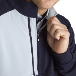elasticidade nas quatro direções, este tecido leve oferece extremo conforto com um design esportivo e permite total amplitude de movimento dentro ou fora do percurso. punhos de malha elástica de conforto adicional proporcionam maior conforto e ajuste durante o uso. construção com meio zíper a construção estendida com meio zíper permite fácil acesso ao desgaste durante mudanças nas condições climáticas. bolso no peito com zíper importado de origem, o bolso no peito protegido dá acesso ao seu scorecard, luva, carteira, sem exposição aos elementos.